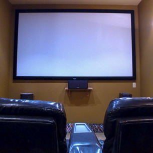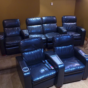 Plush leather seating make watching DVD or satellite movies enjoyable in this state-of-the-art home theatre room with large size projection screen.