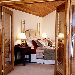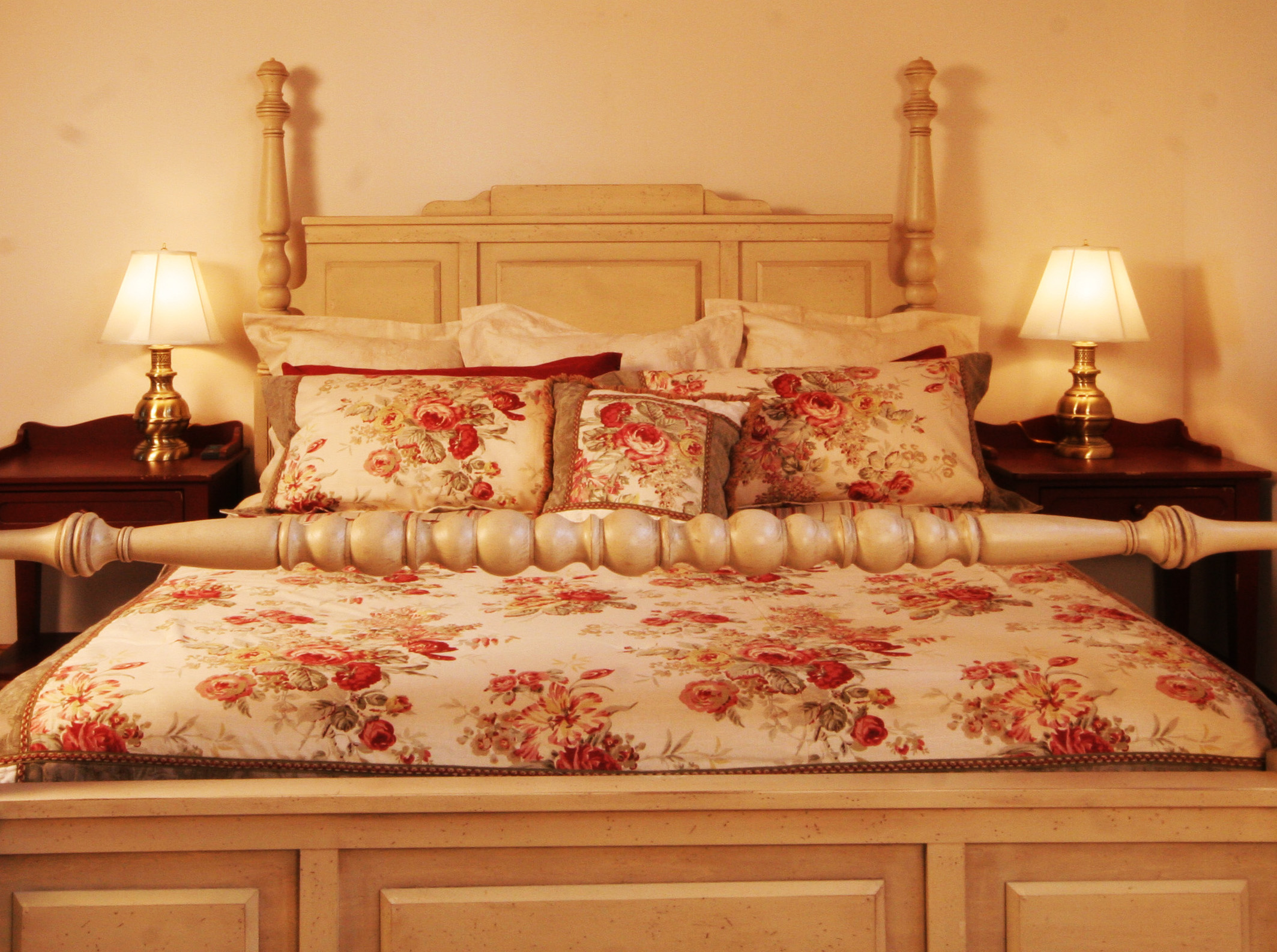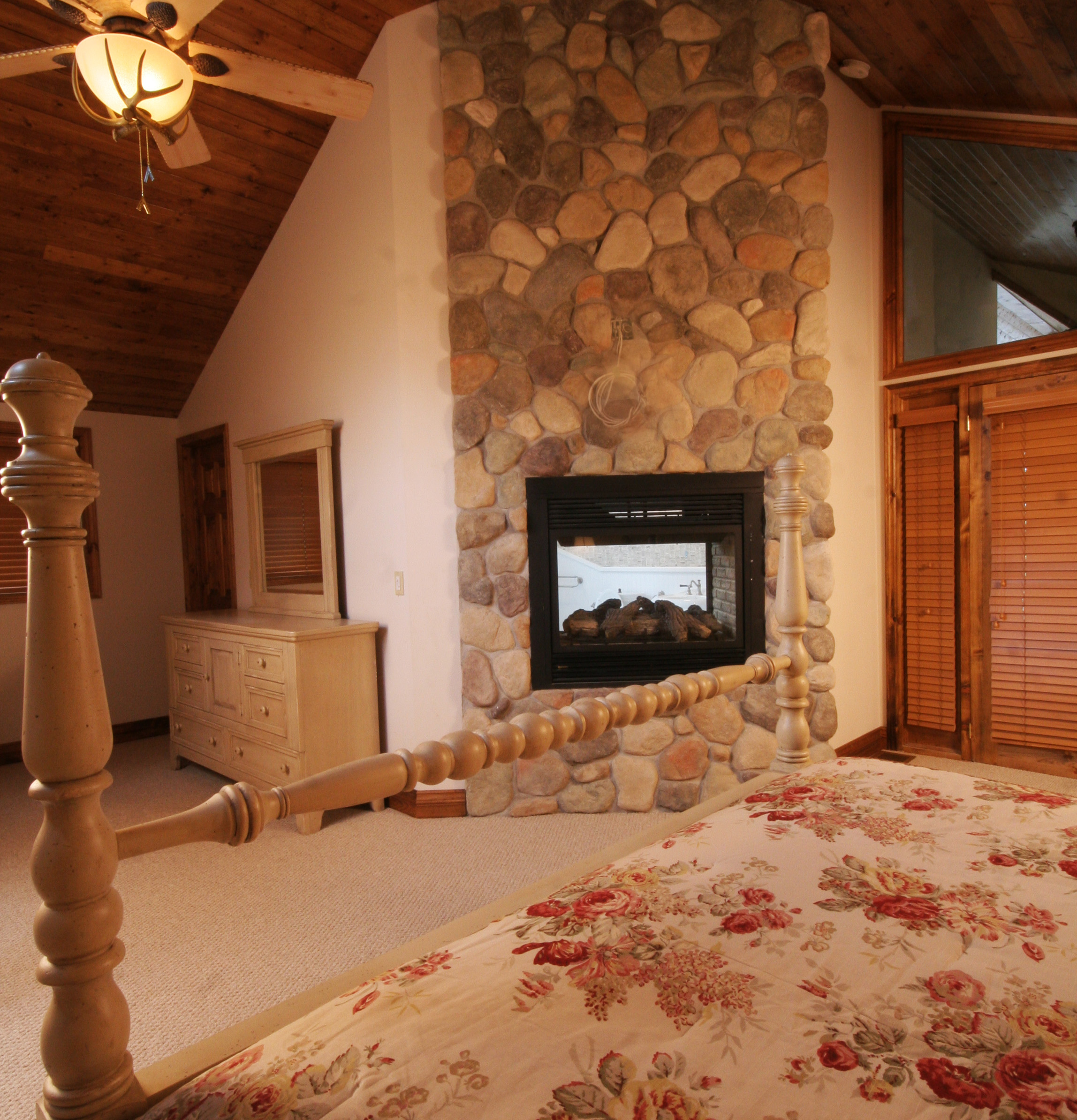 Old fashioned distressed painted furniture and large fireplace gives the Grand Master bedroom a lake lodge of yesteryear feel.